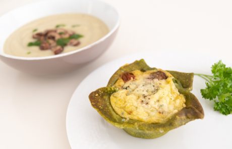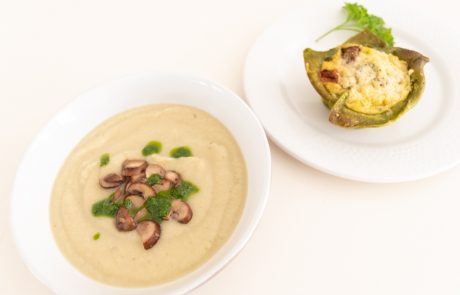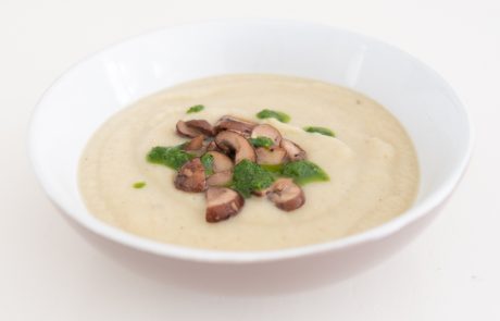 Schenk de soep in kommen en garneer met de champignons en kruidenolie.